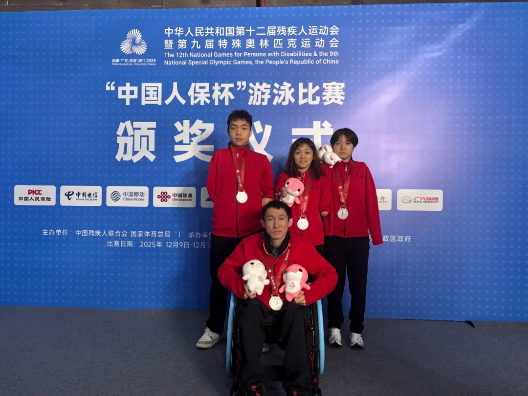 杨洪(左一)、宋思锦(左二)、刘道敏(左三)、何聖羔(左四)合力获残运会男女4×50米混合泳接力-20分银牌