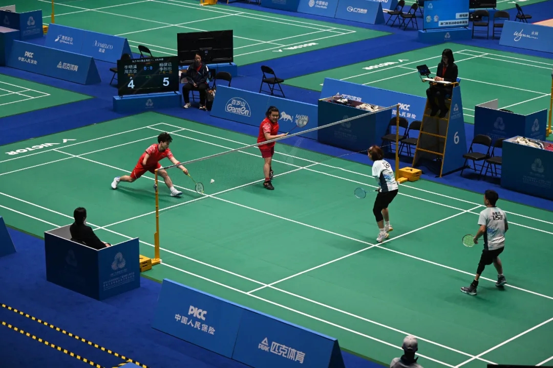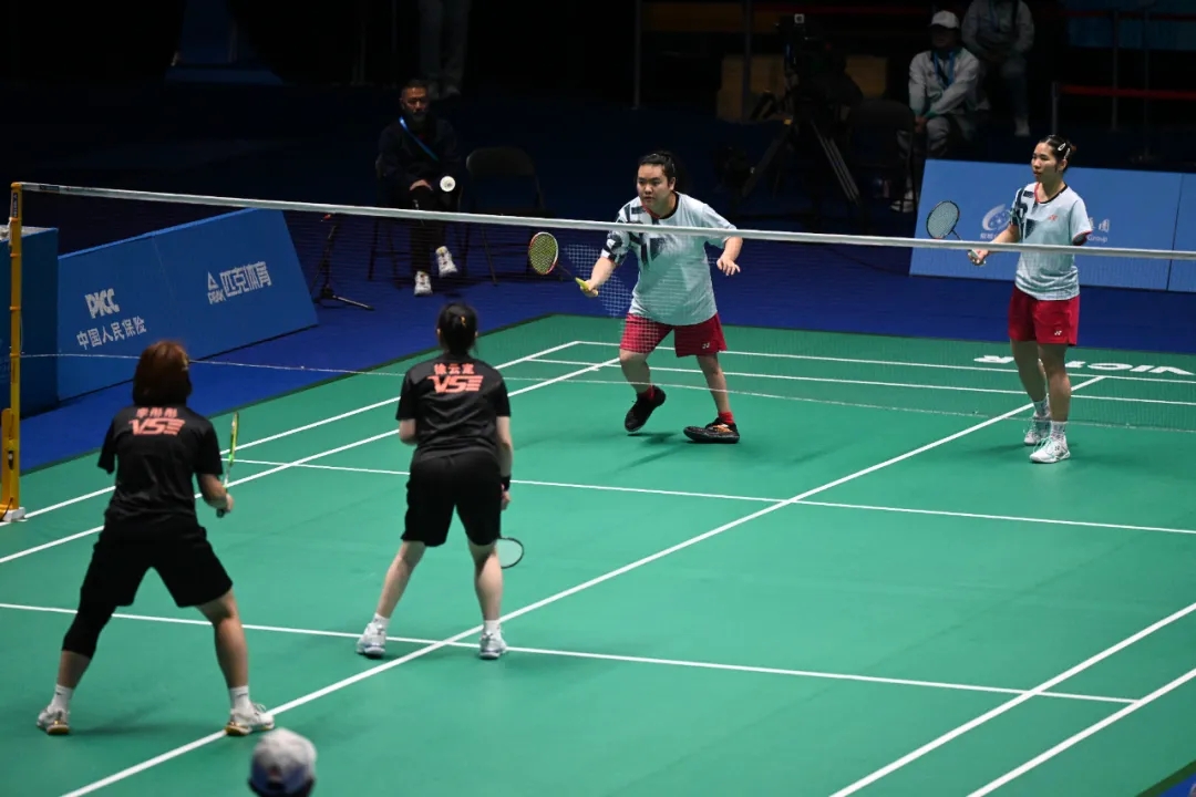 羽毛球项目混合双打SL3-SU5级金牌获得组合李明潘(左一)、周志会(左二)默契搭配接球
