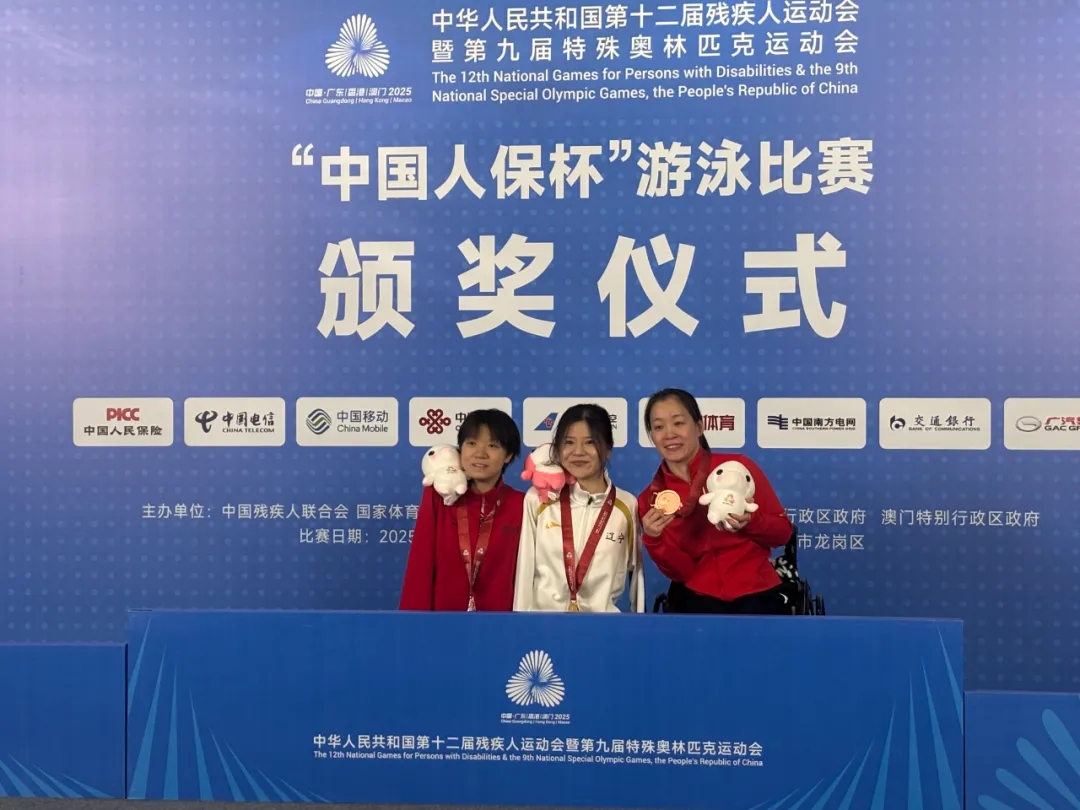 何聖羔(左一)获残运会女子50米仰泳S5级银牌