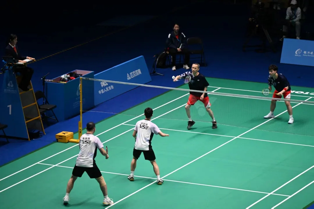 李明潘(右一)、欧伟(右二)在残运会羽毛球项目男子双打SU5级项目中默契配合获金牌