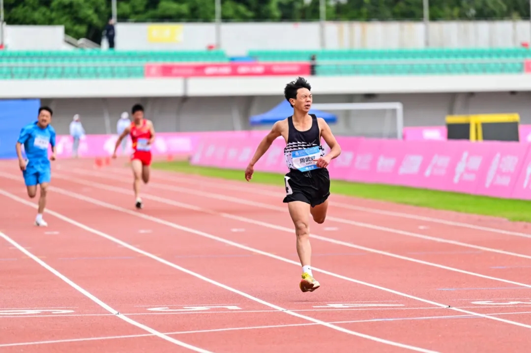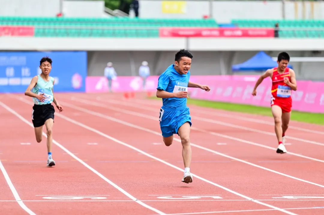 周武双在特奥田径项目男子12-15岁组200米决赛-第7组中全力冲刺,并获金牌