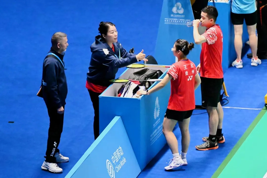 赛中教练给文耀东、王欣鼓励,两名运动员合力获残运会羽毛球项目听障混合双打金牌
