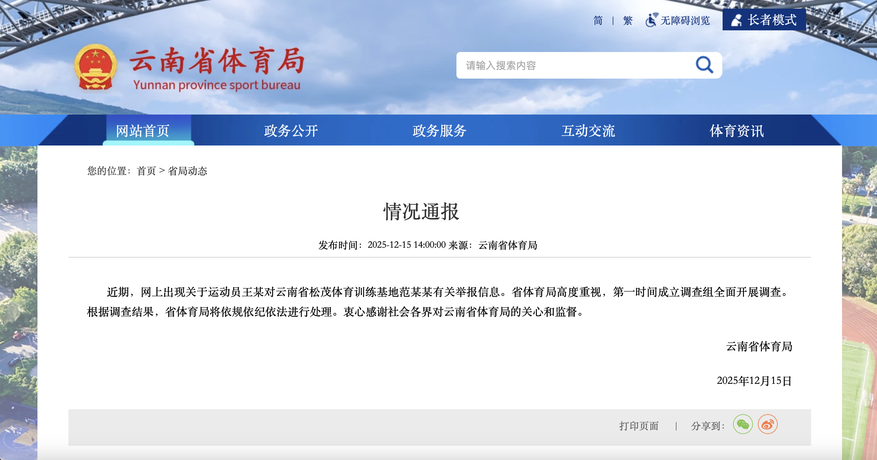 通报称:“近期,网上出现关于运动员王某对云南省松茂体育训练基地范某某有关举报信息。省体育局高度重视,第一时间成立调查组全面开展调查。根据调查结果,省体育局将依规依纪依法进行处理。衷心感谢社会各界对云南省体育局的关心和监督。”