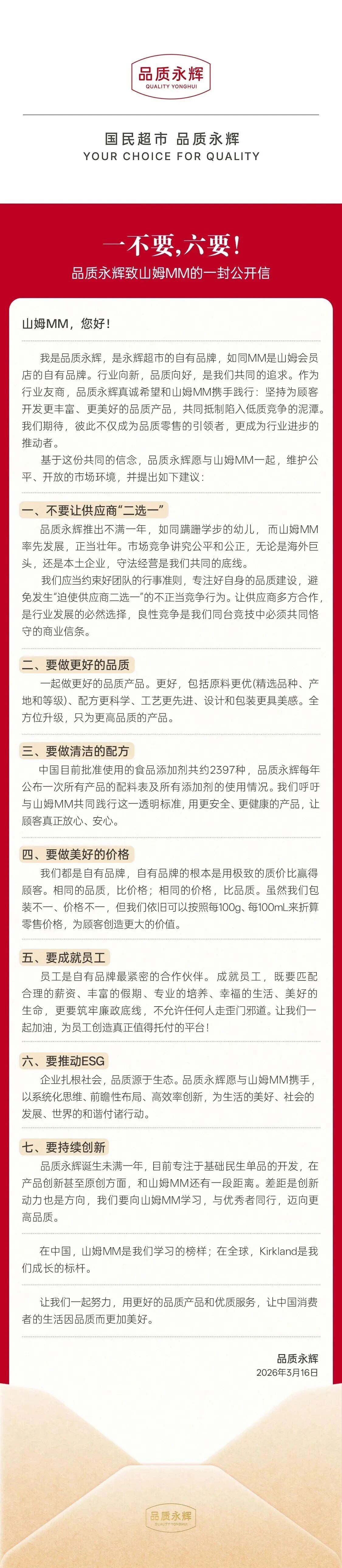 3月16日,永辉超市自有品牌“品质永辉”发布致山姆MM的一封公开信,信中重点呼吁山姆MM不要让供应商“二选一”,表示坚决反对不正当竞争行为,应当约束好团队的行事准则,专注好自身的品质建设