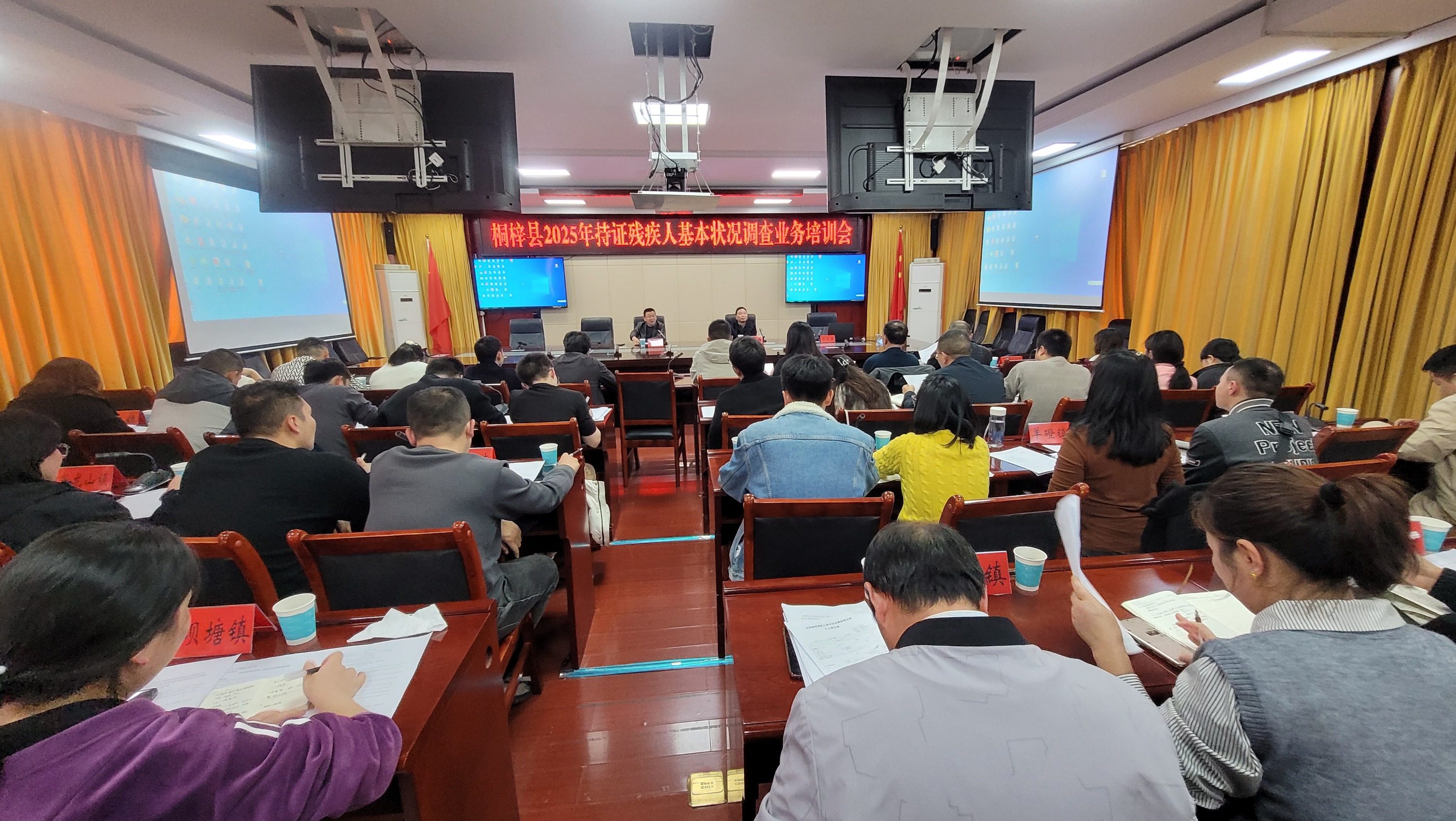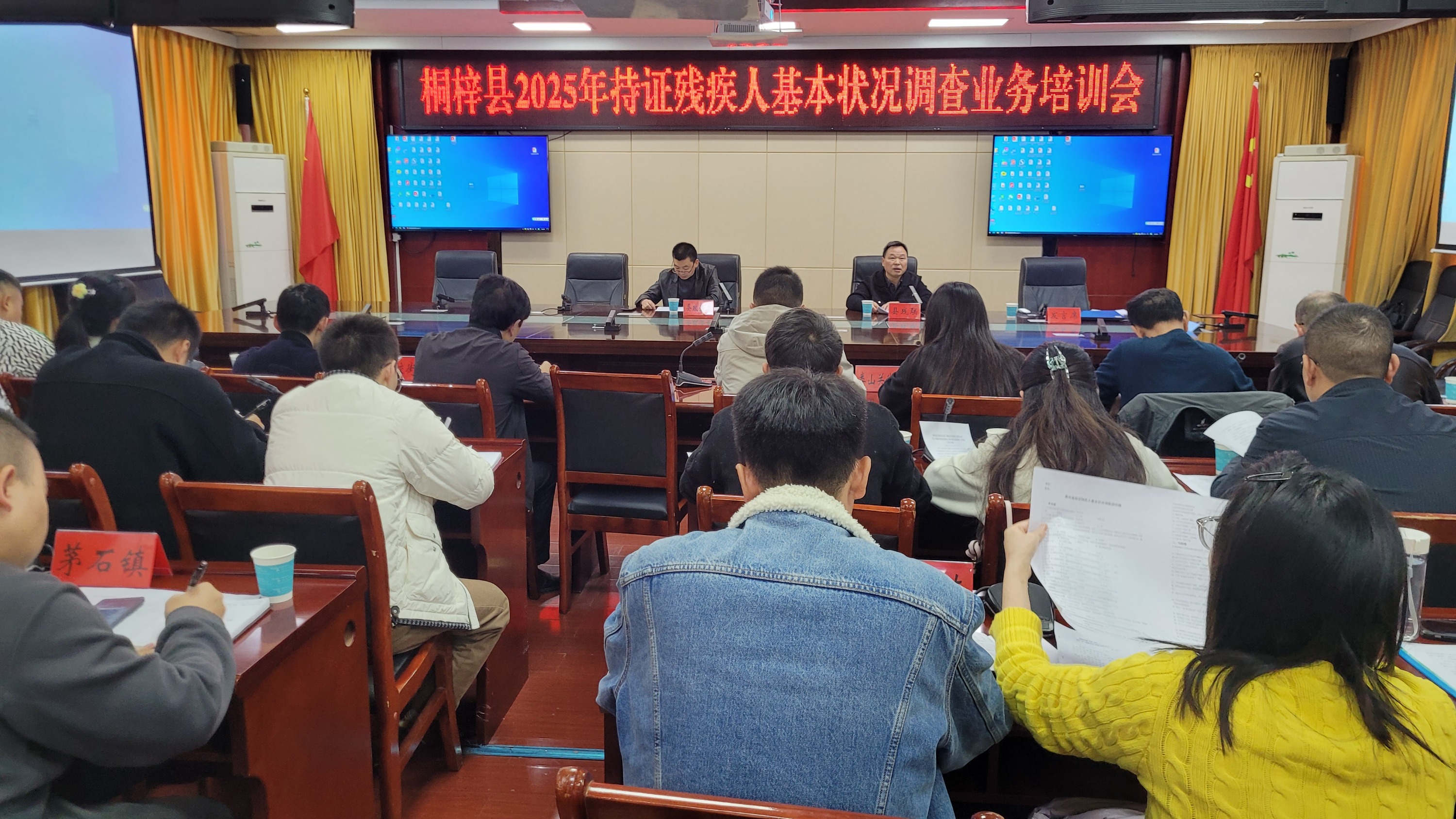 2025年10月27日,由桐梓县委政法委、桐梓县残联共同组织举办的桐梓县2025年持证残疾人基本状况调查业务培训班在县政府四楼会议室举行。培训采用主、分会场结合的模式。25个乡镇(街道)综治中心负责人、残联负责人等60余人在主会场参加培训,全县2350个网格员和乡镇(街道)残联专职委员在各乡镇(街道)分会场参加培训。县残联党组书记、理事长娄永康、县综治中心主任蒋代军全程参加培训。