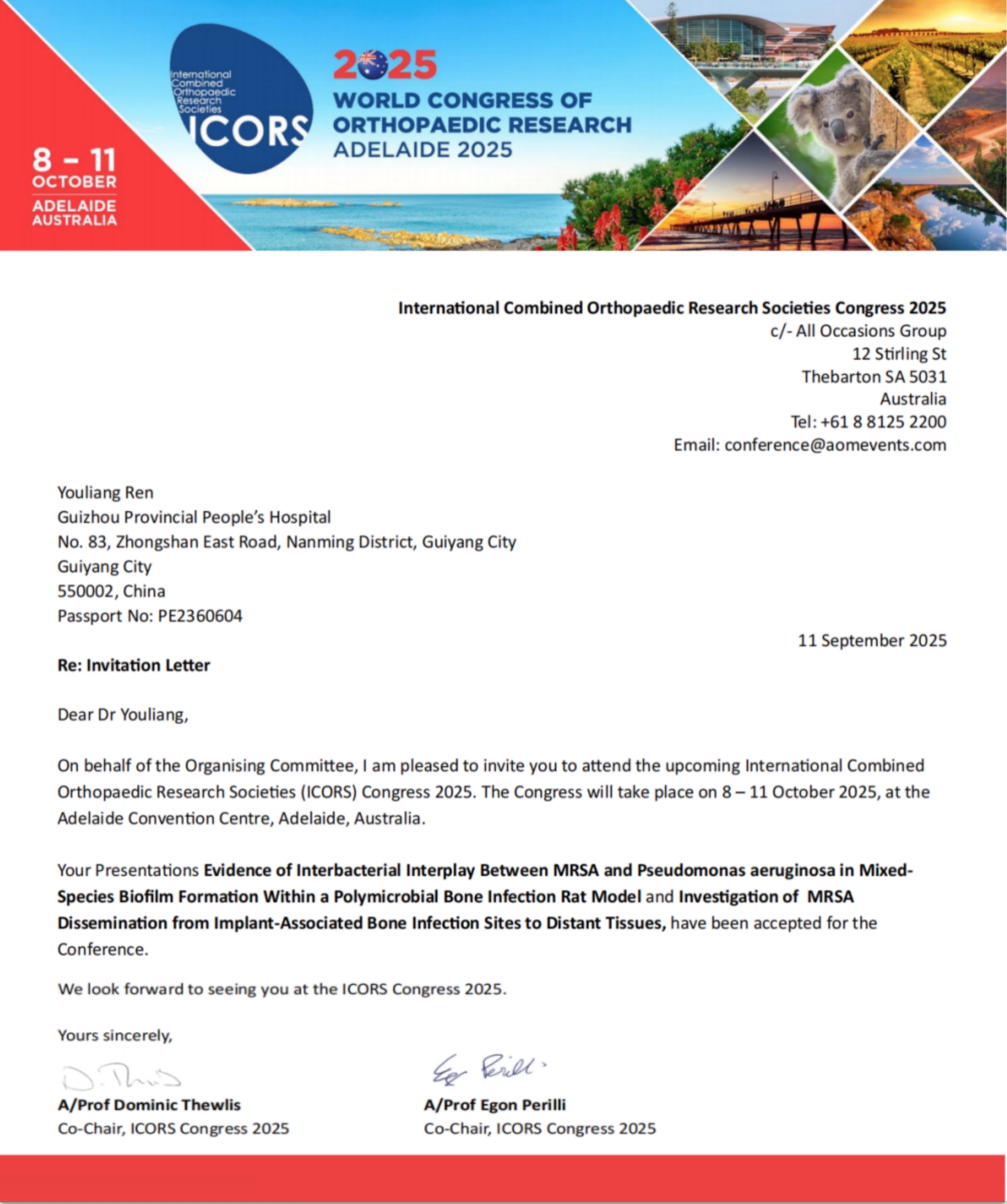近日,贵州省人民医院骨科任有亮博士受邀参加2025年10月8日至11日在澳大利亚阿德莱德会议中心举办的国际骨科研究学会(International Combined Orthopaedic Research Society, ICORS)2025年度大会,并在大会作两场前沿学术报告。