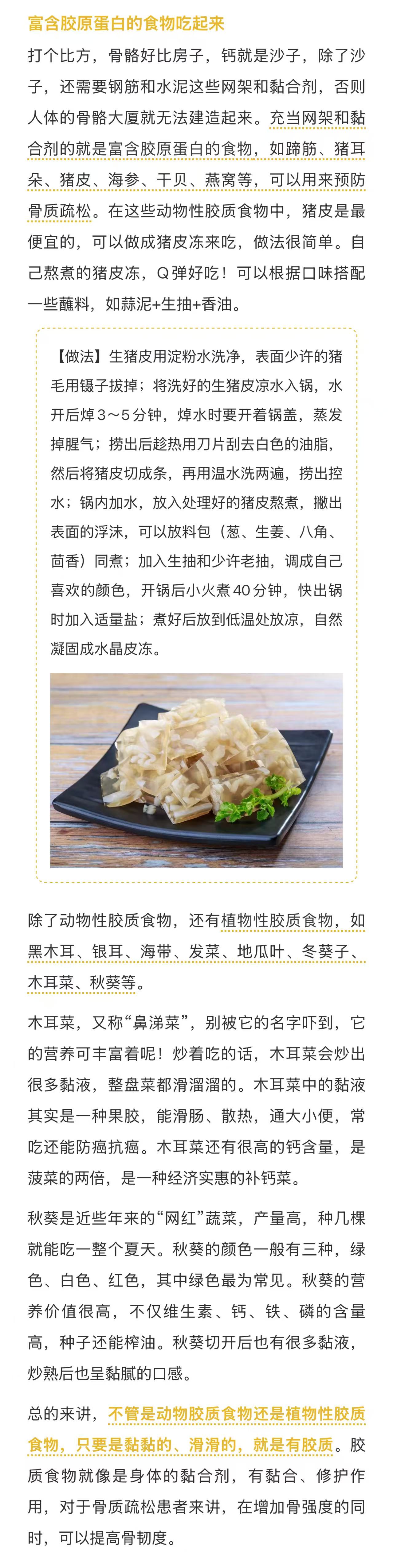 防治骨质疏松,建议多吃富含胶原蛋白的食物