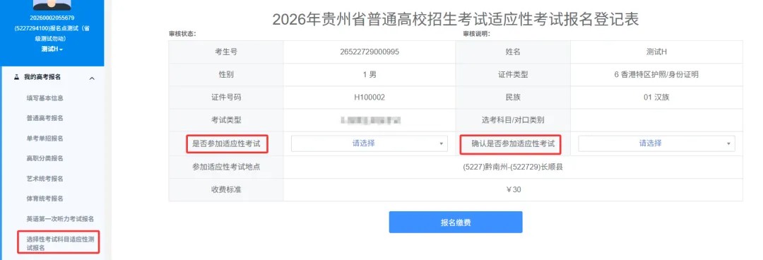 报考选择性考试科目适应性测试的考生,进入【我的高考报名】->【选择性考试科目适应性测试报名】菜单,填报相关信息并线上缴费。