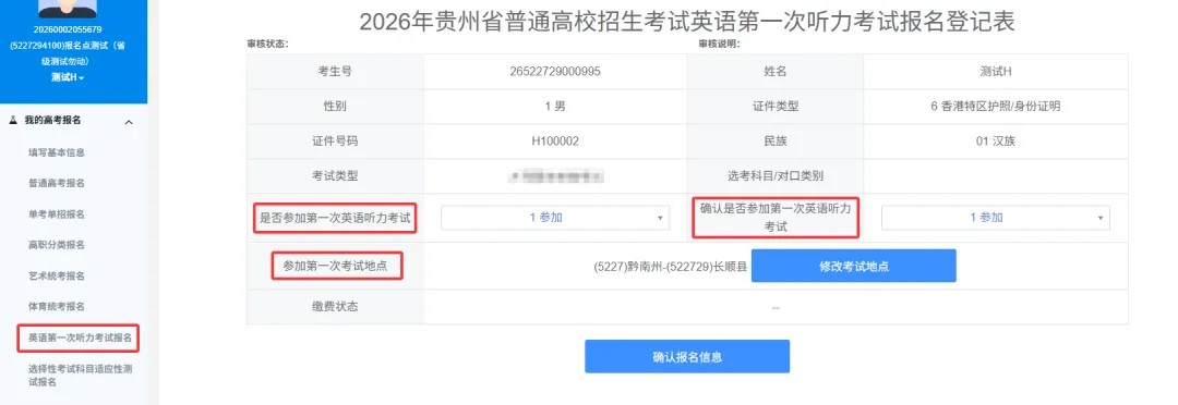 报考英语第一次听力考试的考生,进入【我的高考报名】->【英语第一次听力考试报名】菜单,填报相关信息并线下缴费。