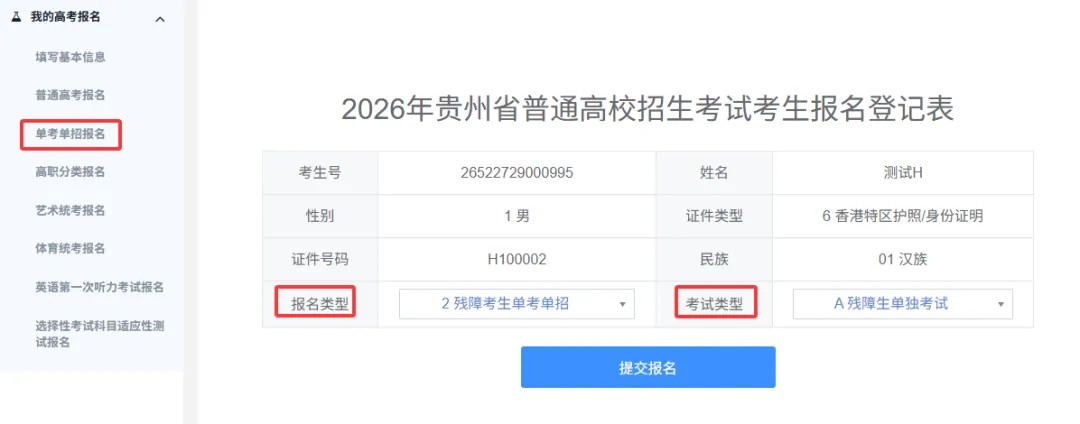 报考消防单招、职教师资考试、残障生单独考试、运动训练、武术与民族传统体育等单独招生的考生,进入【我的高考报名】->【单考单招报名】菜单,填报相关信息。