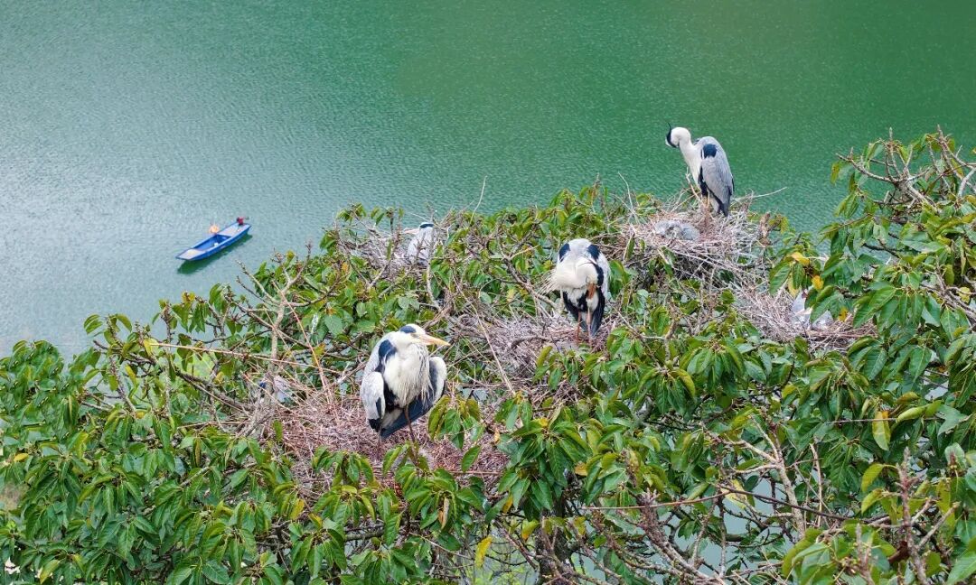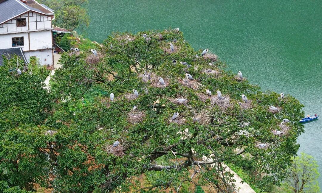 春日的风水镇坪子村圆满贯库区,碧波荡漾、岸线葱郁。成群的苍鹭栖息在一棵有着150多年树龄的黄葛树上,雏鸟在巢中叽叽喳喳,成鸟往返觅食,为静谧的河畔增添了无限生机。